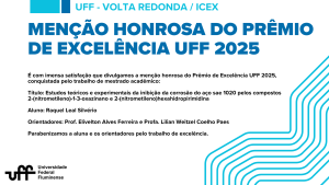 É com imensa satisfação que divulgamos a menção honrosa do Prêmio de Excelência UFF 2025, conquistada pelo trabalho de mestrado acadêmico: Título: Estudos teóricos e experimentais da inibição da corrosão do aço sae 1020 pelos compostos 2-(nitrometileno)-1-3-oxazinano e 2-(nitrometileno)hexahidropirimidina Aluno: Raquel Leal Silvério Orientadores: Prof. Elivelton Alves Ferreira e Profa. Lilian Weitzel Coelho Paes Parabenizamos a aluna e os orientadores pelo trabalho de excelência. Download do Arquivo
