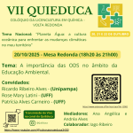 É com grande alegria que divulgamos as inscrições para as mesas redondas do VII QuiEduca 2025 cujo tema local será “A importância dos Objetivos de Desenvolvimento Sustentável (ODS) na formação docente”, e ocorrerá de 20 a 22/10 a partir das 18h, de forma remota, no site do Youtube do Evento. Solicitamos a divulgação dos cards em anexo aos alunos/as, professores/as dos departamentos do ICEx, e enfatizamos a importância da inscrição para posterior certificação. youtube: https://www.youtube.com/@coloquioquieduca3430