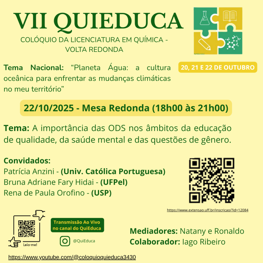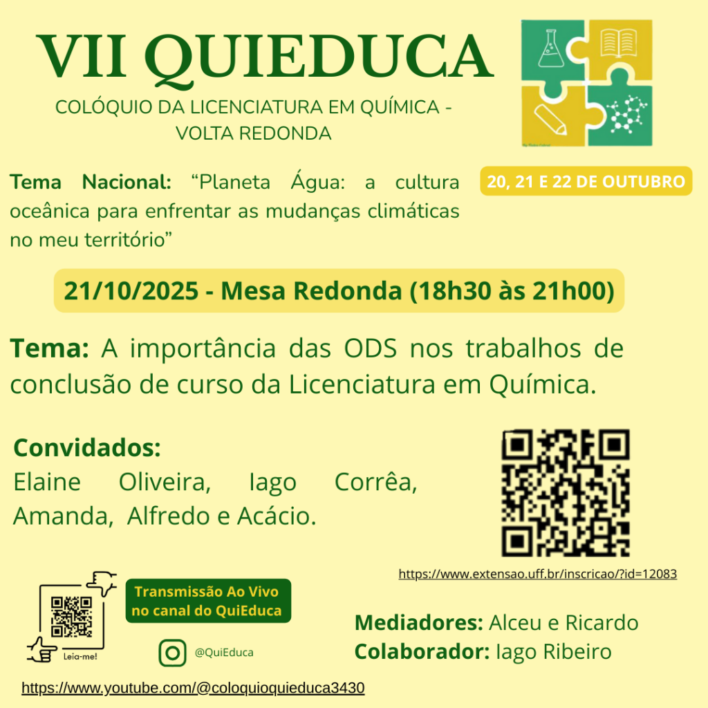 É com grande alegria que divulgamos as inscrições para as mesas redondas do VII QuiEduca 2025 cujo tema local será “A importância dos Objetivos de Desenvolvimento Sustentável (ODS) na formação docente”, e ocorrerá de 20 a 22/10 a partir das 18h, de forma remota, no site do Youtube do Evento.